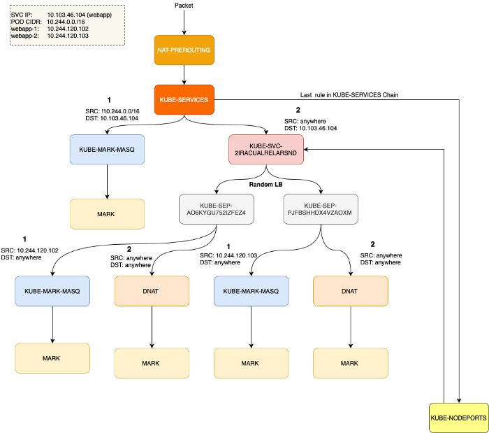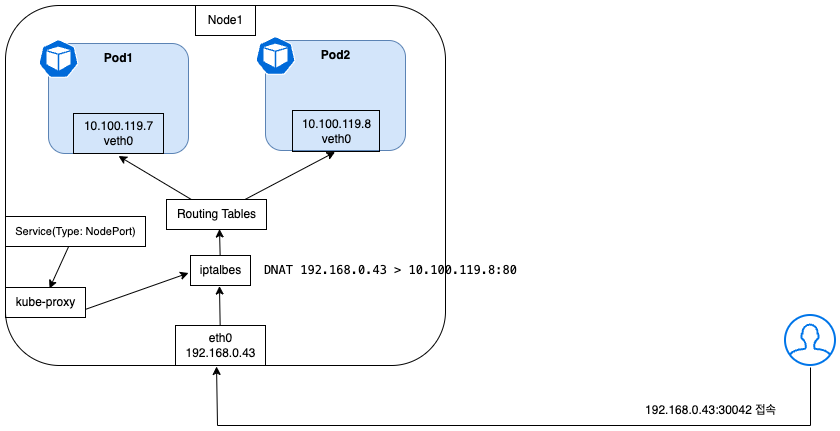 공부를 하다가 NodePort또한 왜 Port가 netstat커맨드로 보이지 않을까 궁금해하시는 분들도 많이 계실 것 같은데요 위 처럼 service는 프로세스 형태로 동작하는 것이 아닌 iptables에 세팅된 하나의 룰이기 때문에 보이지 않았던 것입니다.(참고로 iptables는 체인 및 룰을 설정하는 tool이고, 실제 패킷의 이동에 대한 관여는 netfilter가 수행하게 됩니다. netfilter는 리눅스 커널의 네트워크 스택에 내장된 패킷 처리 프레임워크입니다.)